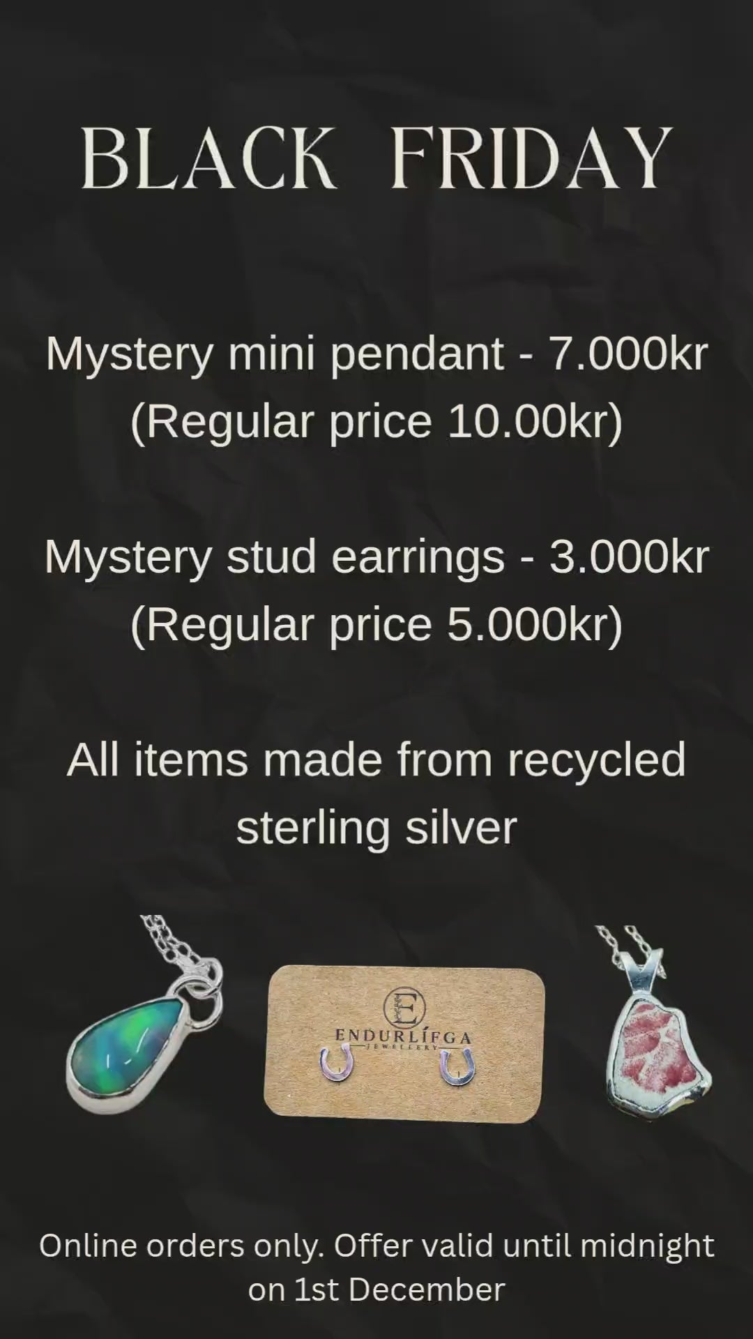 Order a 'mystery' mini pendant (value 10.000kr) for only 7.000kr! Or alternatively order a 'mystery' pair of earrings (value 5.000kr) for only 3.000kr!