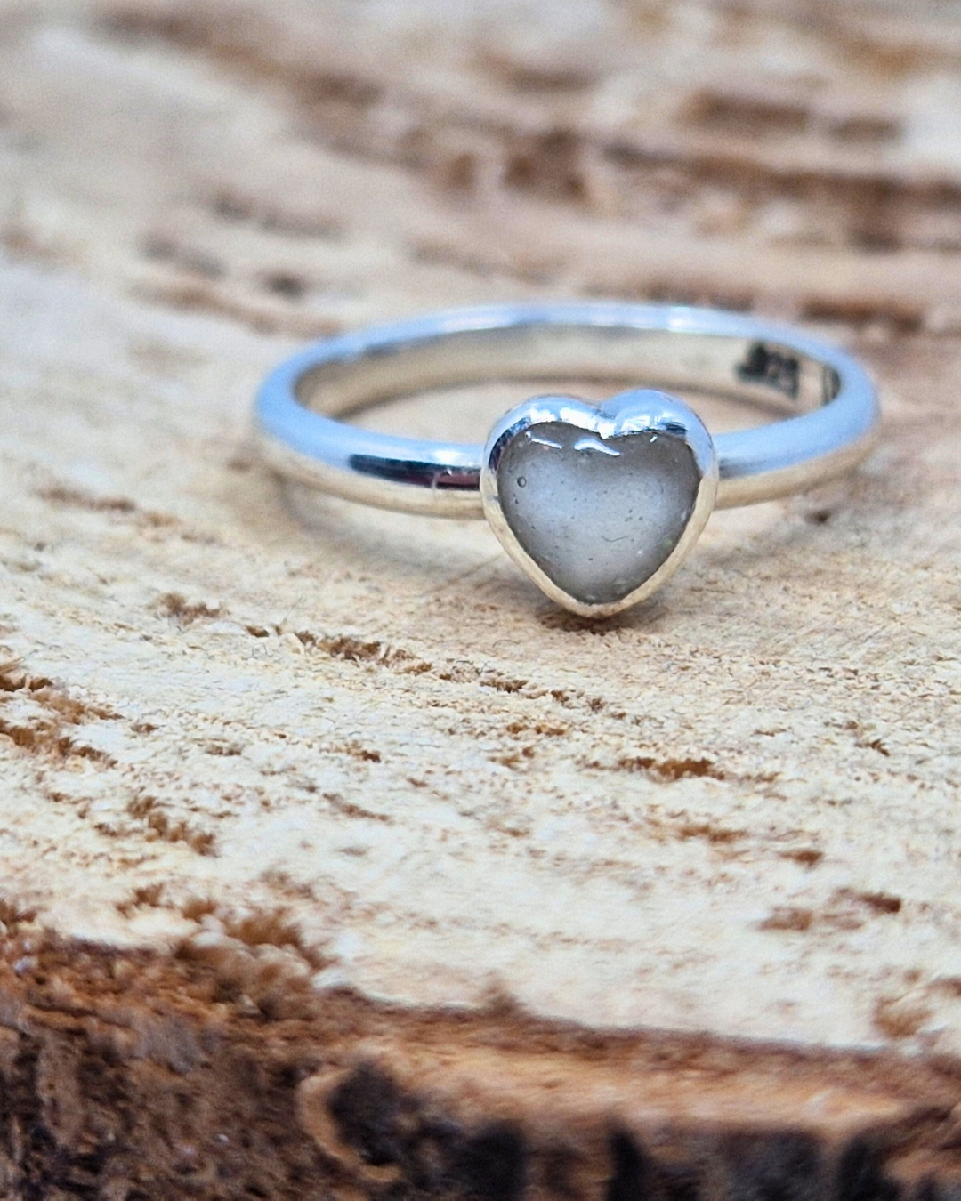 Celebrate your breastfeeding journey with our stunning heart shaped ring. Crafted with care from recycled sterling silver, this elegant ring is designed to symbolize the deep love and connection shared between parent and child. Each ring is handmade to order, making it a truly unique piece to treasure for years to come. And the best part? You can personalize it by adding your choice of inclusion, whether it's golden flakes for a touch of warmth, opalescent mylar flakes for a dreamy iridescence, or forget-me-not flowers for a delicate, timeless beauty. Wear it on your finger as a reminder of the beautiful journey of breastfeeding, or gift it to a special mother in your life. With its timeless design and customisable options, this ring is sure to become a cherished heirloom.
